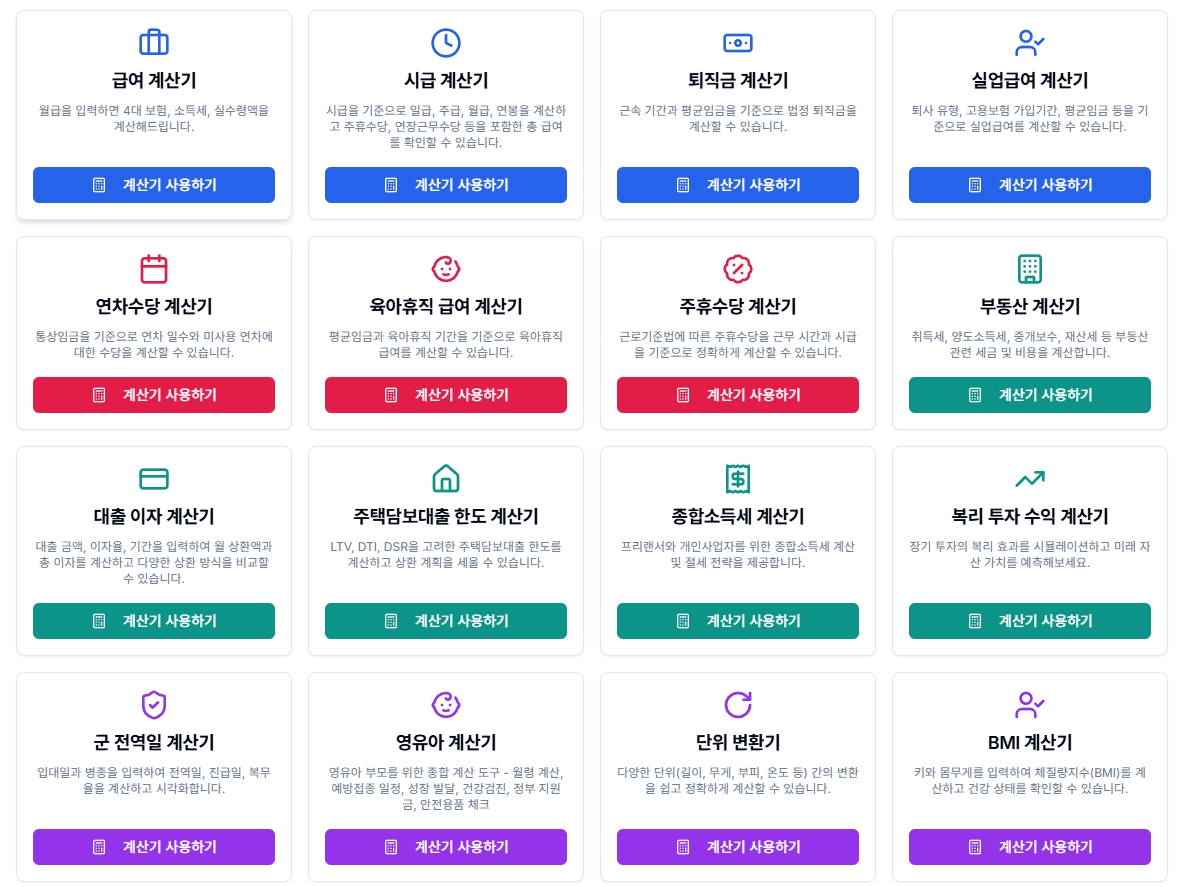 • 📌 일부 계산기는 최신 법령 반영이 지연될 수 있으므로 사용 시 날짜 확인 필수입니다.