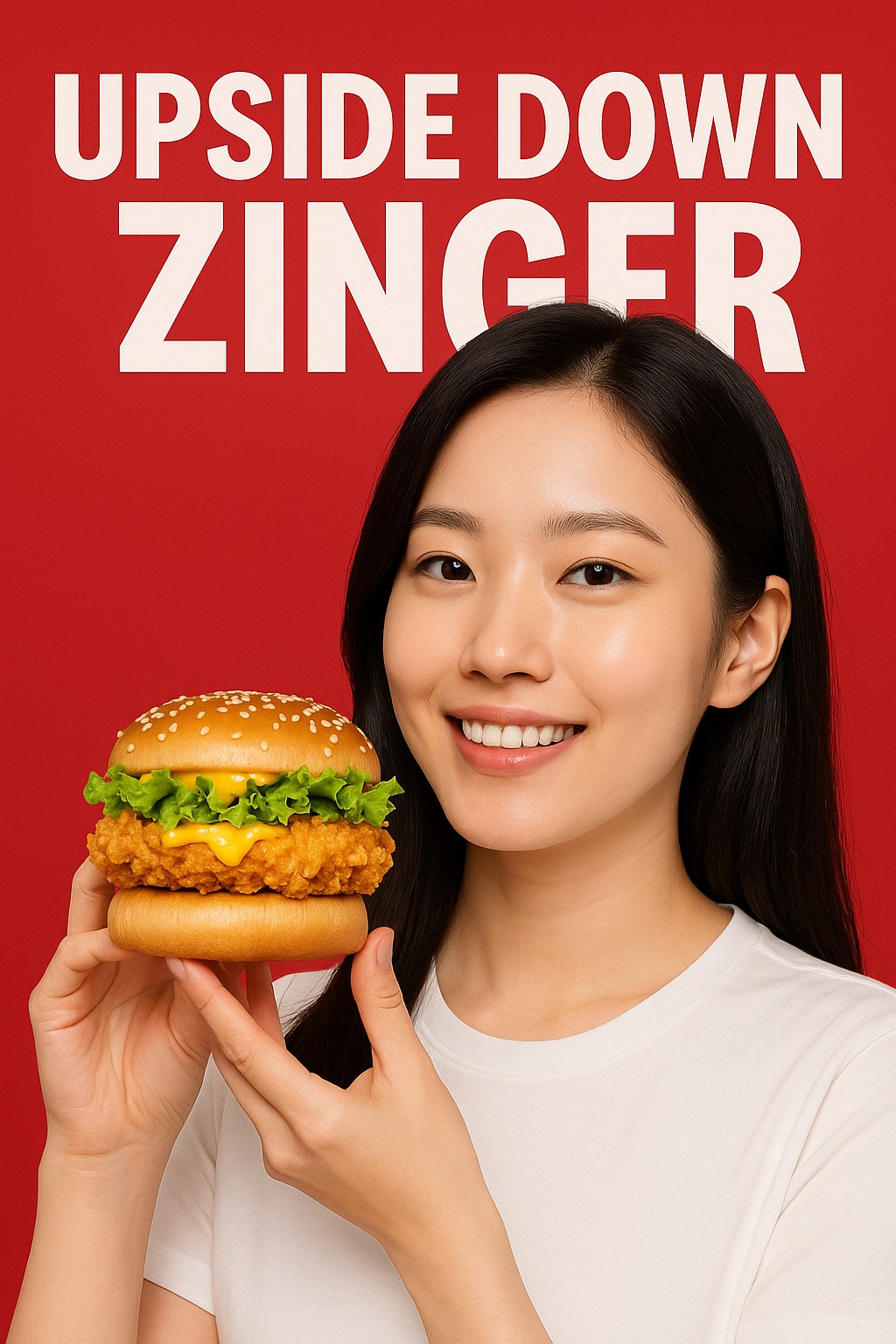 '업사이드다운(Upside Down)'이라는 이름처럼, 기존 징거버거의 구성을 위아래 뒤집은 독특한 형태로 만든 제품입니다.