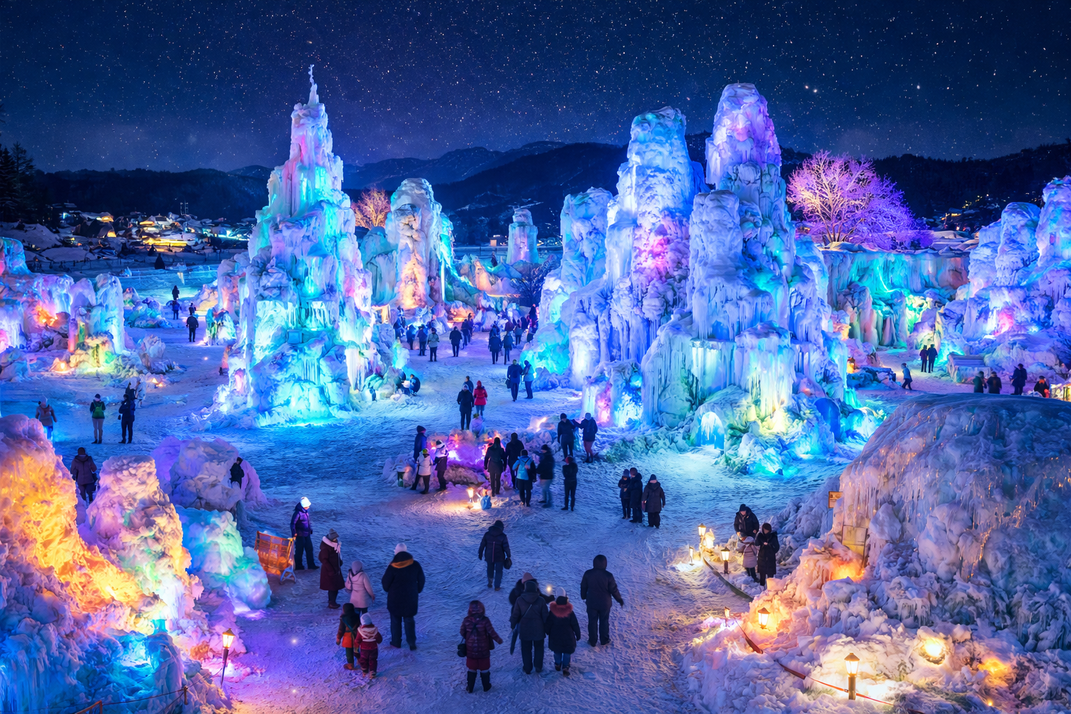 대형 얼음분수와 야간 조명이 어우러져 사진 명소로 인기가 많습니다.