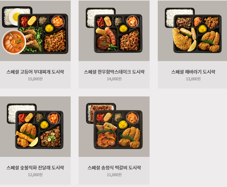 | 프리미엄 / 모둠 도시락 (예: 진달래, 동백 등) | 햄버그스테이크, 돈가스, 제육볶음, 치킨가라아게 등 다양한 반찬 포함 — 든든한 한 끼 | 약 8,000원대 전후 (구성/매장 따라 다름) |