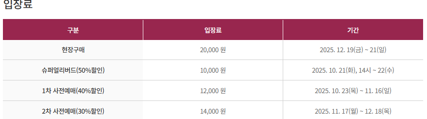 - 사전예매: 슈퍼얼리버드,1차,2차에 따라 다름