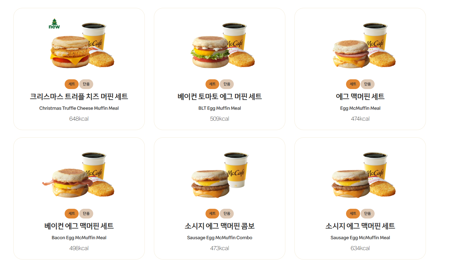 | 메뉴 유형 | 머핀·아침식 메뉴 | 버거 세트(할인가) |