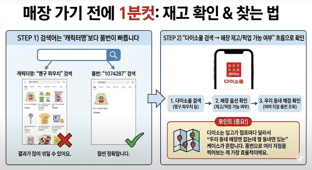- ✅ 다이소몰에서 “맹구 파우치” 또는 품번으로 검색해 후보 매장 추리기