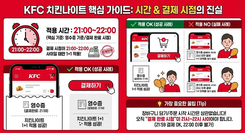 kfc 치킨나이트는 매일 21:00~22:00에 “1+1 표기 상품”을 결제 완료하면 적용되는 프로모션이라, **시간(결제시점)**과 **가격 확인(1+1 대상 상품)**을 정확히 알아야 손해를 안 봅니다.